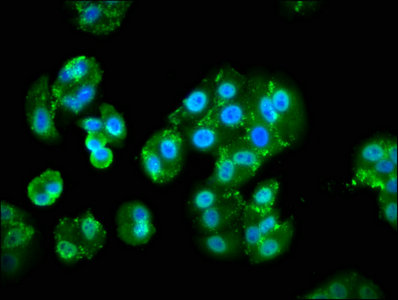 Immunofluorescence staining of HepG2 cells with CSB-PA017998LA01HU at 1:133, counter-stained with DAPI. The cells were fixed in 4% formaldehyde, permeabilized using 0.2% Triton X-100 and blocked in 10% normal Goat Serum. The cells were then incubated with the antibody overnight at 4°C. The secondary antibody was Alexa Fluor 488-congugated AffiniPure Goat Anti-Rabbit IgG(H+L).