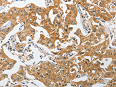 The image on the left is immunohistochemistry of paraffin-embedded Human lung cancer tissue using CSB-PA159945(PIK3R3 Antibody) at dilution 1/25, on the right is treated with synthetic peptide. (Original magnification: ×200)