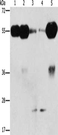 Gel: 10%SDS-PAGE, Lysate: 40 μg, Lane 1-5: Mouse brain tissue, human fetal brain tissue, mouse testis tissue, hela cells, human fetal kidney tissue, Primary antibody: CSB-PA159945(PIK3R3 Antibody) at dilution 1/250, Secondary antibody: Goat anti rabbit IgG at 1/8000 dilution, Exposure time: 2 minutes