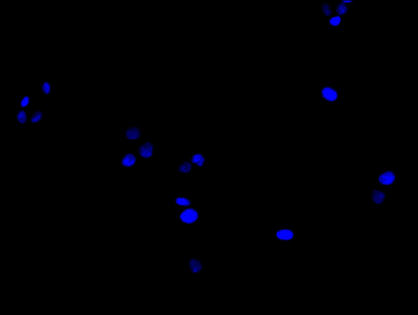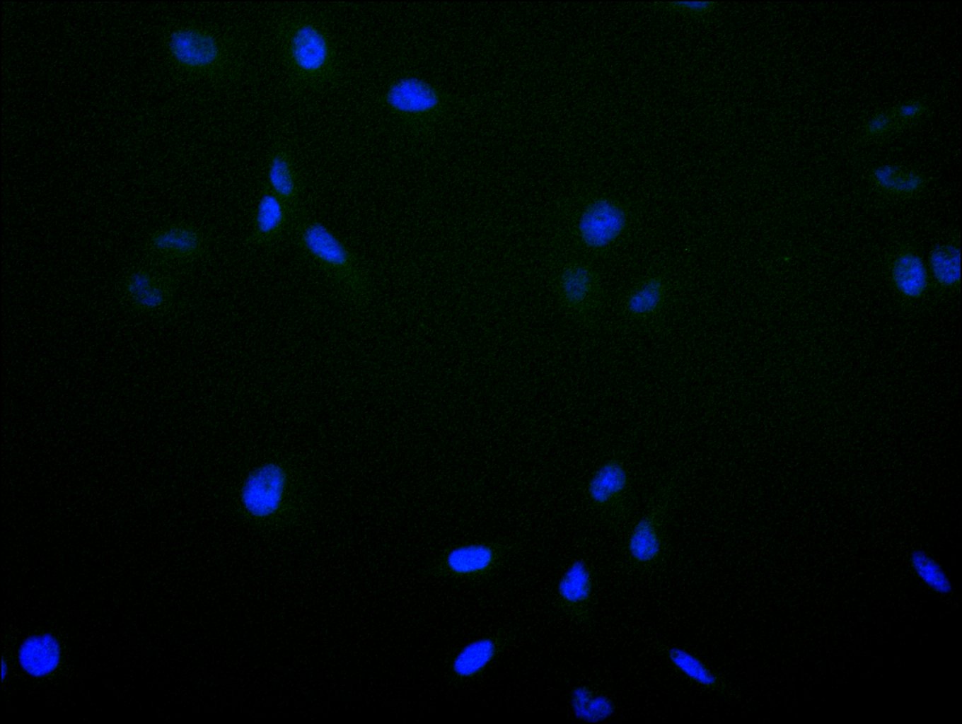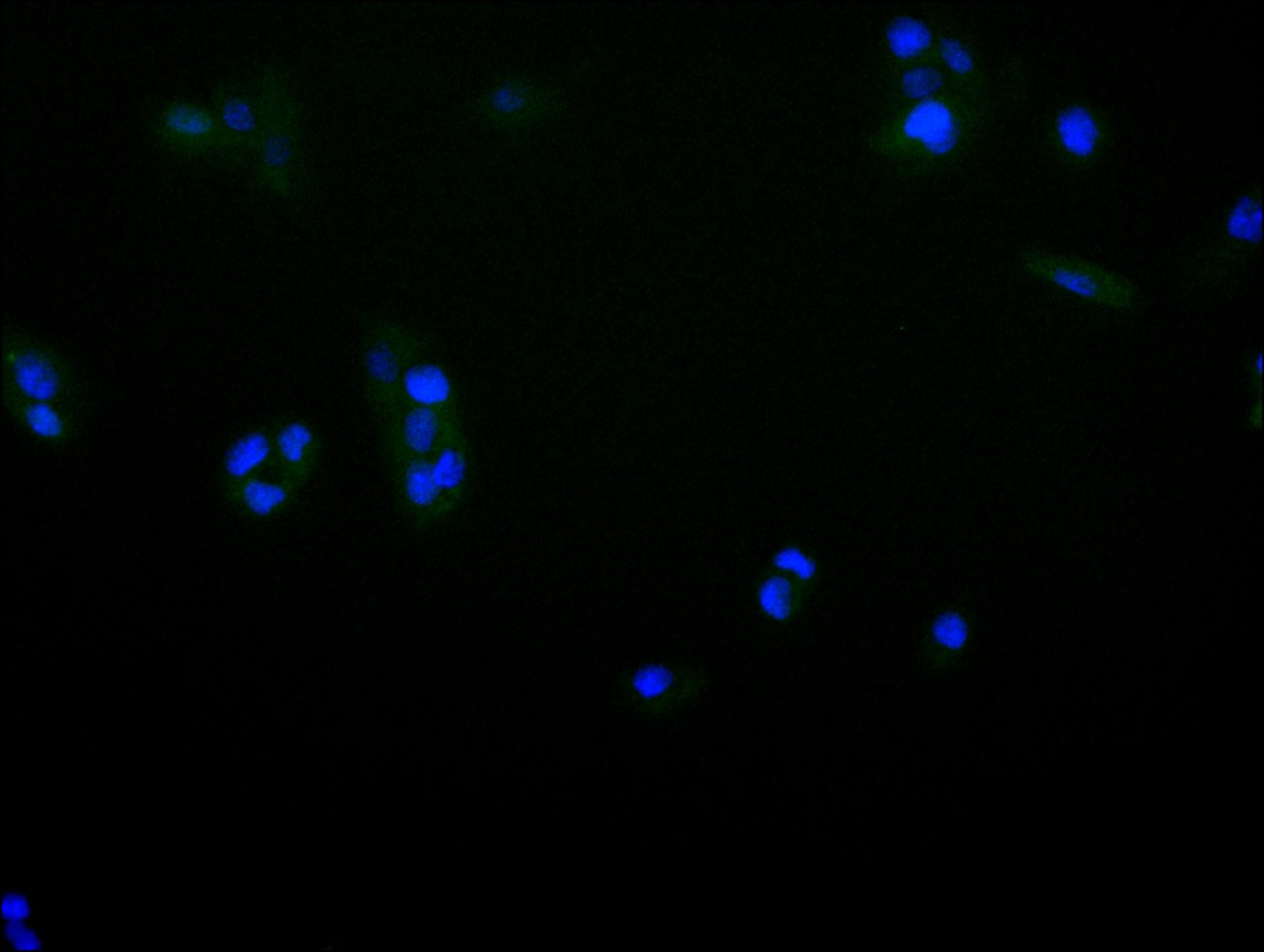 Immunofluorescence staining of MCF7 cell with CSB-PA861478LA01HU at 1:30, counter-stained with DAPI. The cells were fixed in 4% formaldehyde and and permeated by 0.2% TritonX-100 for 15 min. Then 10% normal goat serum to block non-specific protein-protein interactions . The cells were then incubated with the antibody overnight at 4℃. The secondary antibody was Alexa Fluor 488-congugated AffiniPure Goat Anti-Rabbit IgG(H+L).