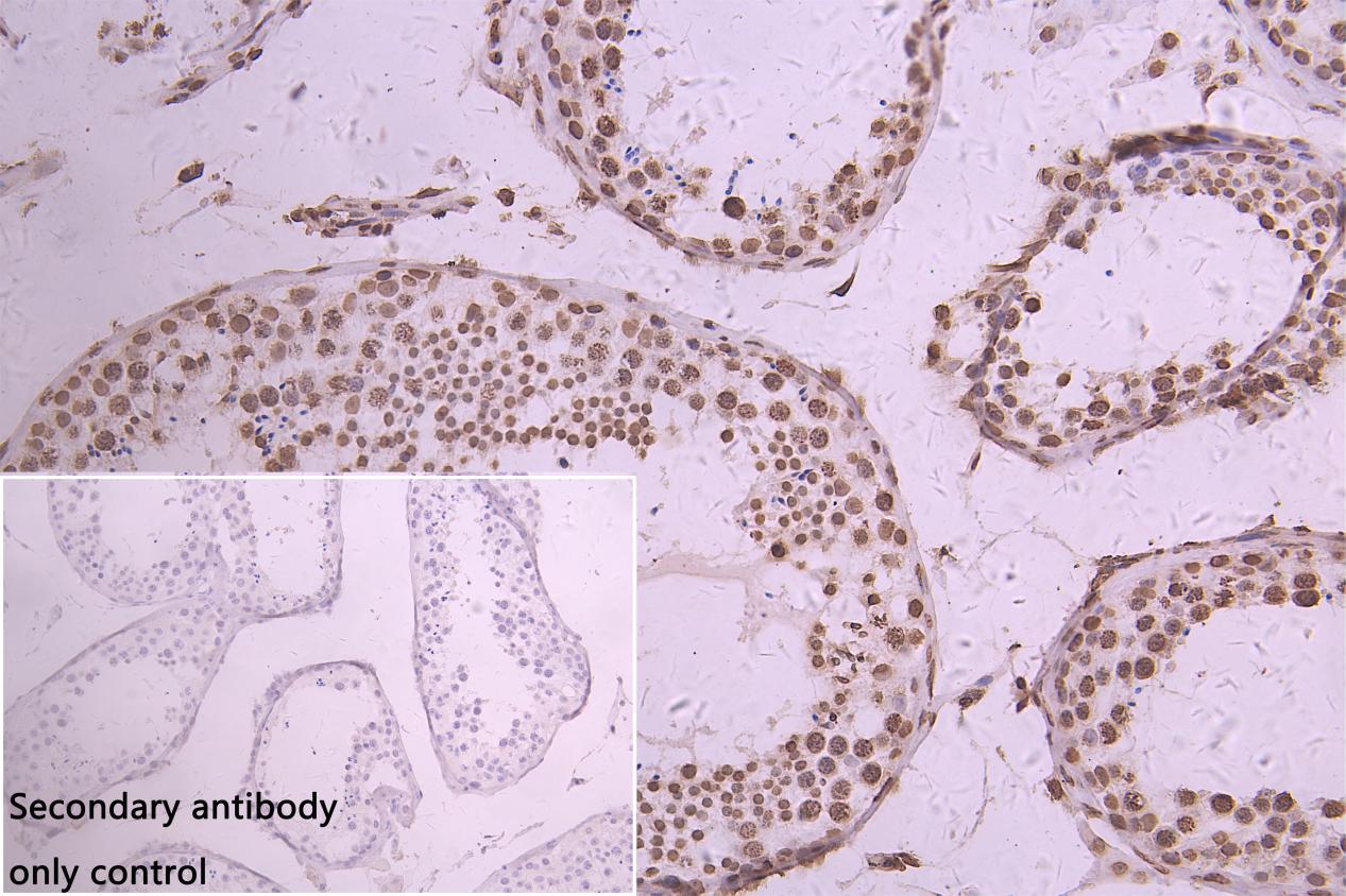 IHC image of CSB-PA861478LA01HU diluted at 1:100 and staining in paraffin-embedded human testis tissue performed on a Leica BondTM system. After dewaxing and hydration, antigen retrieval was mediated by high pressure in a citrate buffer (pH 6.0). Section was blocked with 10% normal goat serum 30min at RT. Then primary antibody (1% BSA) was incubated at 4°C overnight. The primary is detected by a Goat anti-rabbit polymer IgG labeled by HRP and visualized using 0.05% DAB. Secondary antibody only control: uses 1% BSA instead of primary antibody