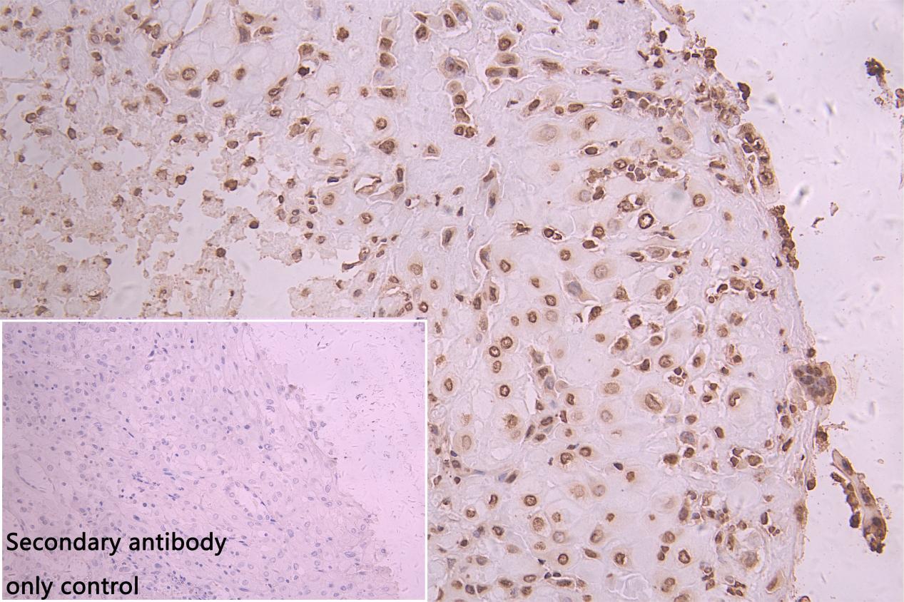 IHC image of CSB-PA861478LA01HU diluted at 1:100 and staining in paraffin-embedded human placenta tissue performed on a Leica BondTM system. After dewaxing and hydration, antigen retrieval was mediated by high pressure in a citrate buffer (pH 6.0). Section was blocked with 10% normal goat serum 30min at RT. Then primary antibody (1% BSA) was incubated at 4°C overnight. The primary is detected by a Goat anti-rabbit polymer IgG labeled by HRP and visualized using 0.05% DAB. Secondary antibody only control: uses 1% BSA instead of primary antibody