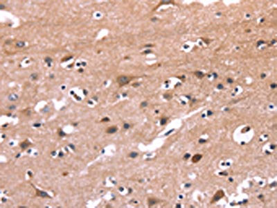 The image on the left is immunohistochemistry of paraffin-embedded Human brain tissue using CSB-PA212653(PIP5K1B Antibody) at dilution 1/30, on the right is treated with fusion protein. (Original magnification: ×200)