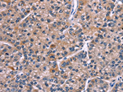 The image on the left is immunohistochemistry of paraffin-embedded Human liver cancer tissue using CSB-PA137893(PIP5K1B Antibody) at dilution 1/30, on the right is treated with fusion protein. (Original magnification: ×200)