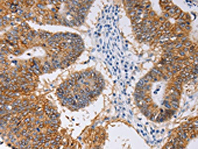 The image on the left is immunohistochemistry of paraffin-embedded Human colon cancer tissue using CSB-PA571908(PIWIL1 Antibody) at dilution 1/30, on the right is treated with fusion protein. (Original magnification: ×200)