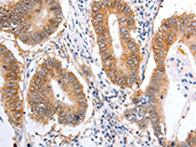 The image on the left is immunohistochemistry of paraffin-embedded Human colon cancer tissue using CSB-PA176370(PIWIL1 Antibody) at dilution 1/25, on the right is treated with fusion protein. (Original magnification: ×200)
