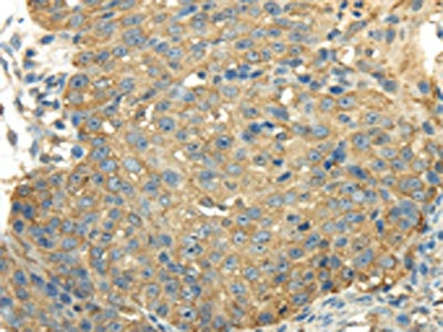 The image on the left is immunohistochemistry of paraffin-embedded Human thyroid cancer tissue using CSB-PA292244(PKM Antibody) at dilution 1/25, on the right is treated with synthetic peptide. (Original magnification: ×200)