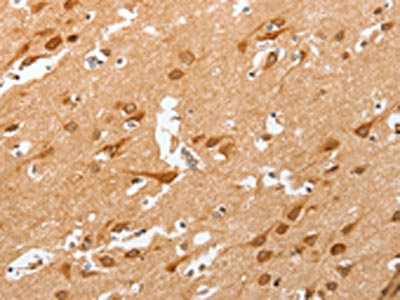 The image on the left is immunohistochemistry of paraffin-embedded Human brain tissue using CSB-PA941696(PLA2G4A Antibody) at dilution 1/50, on the right is treated with fusion protein. (Original magnification: ×200)