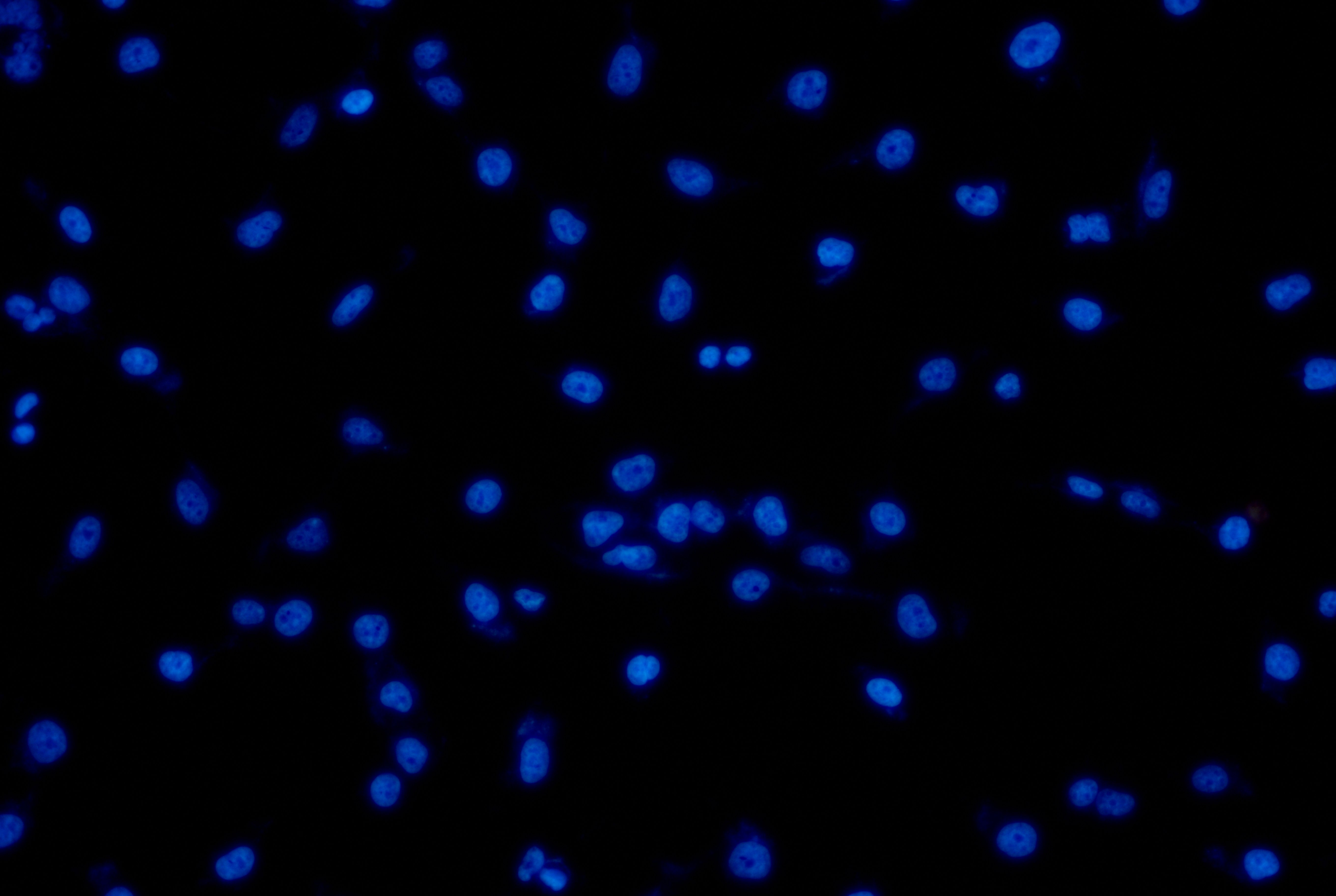 Immunofluorescence staining of A549 cell with 5% goat serum, counter-stained with DAPI. The cells were fixed in 4% formaldehyde and blocked in 10% normal Goat Serum. The cells were then incubated with the antibody overnight at 4C. The secondary antibody was Alexa Fluor 488-congugated AffiniPure Goat Anti-Rabbit IgG(H+L).