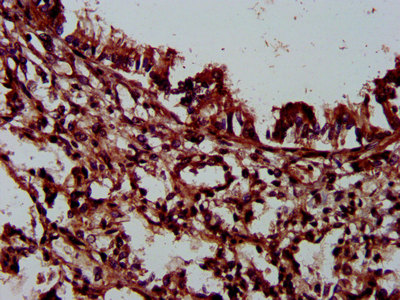 IHC image of CSB-PA619965LA01HU diluted at 1:300 and staining in paraffin-embedded human lung tissue performed on a Leica BondTM system. After dewaxing and hydration, antigen retrieval was mediated by high pressure in a citrate buffer (pH 6.0). Section was blocked with 10% normal goat serum 30min at RT. Then primary antibody (1% BSA) was incubated at 4°C overnight. The primary is detected by a biotinylated secondary antibody and visualized using an HRP conjugated SP system.