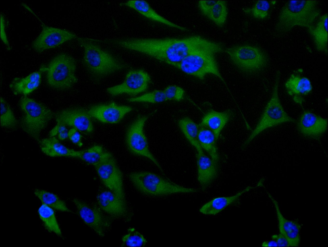 Immunofluorescence staining of U251 cell with CSB-PA875713LA01HU at 1:30, counter-stained with DAPI. The cells were fixed in 4% formaldehyde and blocked in 10% normal Goat Serum. The cells were then incubated with the antibody overnight at 4C. The secondary antibody was Alexa Fluor 488-congugated AffiniPure Goat Anti-Rabbit IgG(H+L).