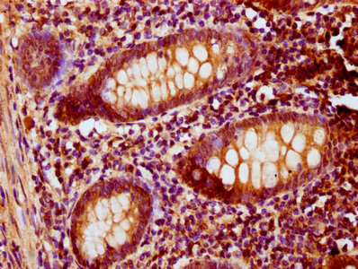 IHC image of CSB-PA754178LA01HU diluted at 1:200 and staining in paraffin-embedded human appendix tissue performed on a Leica BondTM system. After dewaxing and hydration, antigen retrieval was mediated by high pressure in a citrate buffer (pH 6.0). Section was blocked with 10% normal goat serum 30min at RT. Then primary antibody (1% BSA) was incubated at 4°C overnight. The primary is detected by a biotinylated secondary antibody and visualized using an HRP conjugated SP system.
