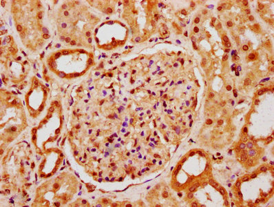 IHC image of CSB-PA889087LA01HU diluted at 1:400 and staining in paraffin-embedded human kidney tissue performed on a Leica BondTM system. After dewaxing and hydration, antigen retrieval was mediated by high pressure in a citrate buffer (pH 6.0). Section was blocked with 10% normal goat serum 30min at RT. Then primary antibody (1% BSA) was incubated at 4°C overnight. The primary is detected by a biotinylated secondary antibody and visualized using an HRP conjugated SP system.