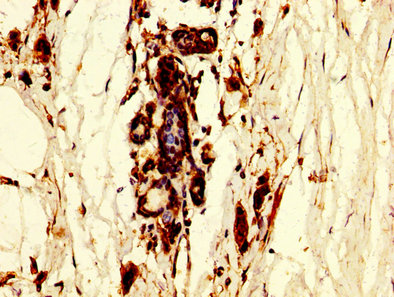IHC image of CSB-PA885742LA01HU diluted at 1:300 and staining in paraffin-embedded human breast cancer performed on a Leica BondTM system. After dewaxing and hydration, antigen retrieval was mediated by high pressure in a citrate buffer (pH 6.0). Section was blocked with 10% normal goat serum 30min at RT. Then primary antibody (1% BSA) was incubated at 4°C overnight. The primary is detected by a biotinylated secondary antibody and visualized using an HRP conjugated SP system.