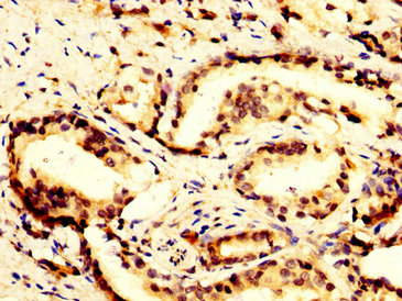 IHC image of CSB-PA885742LA01HU diluted at 1:300 and staining in paraffin-embedded human prostate cancer performed on a Leica BondTM system. After dewaxing and hydration, antigen retrieval was mediated by high pressure in a citrate buffer (pH 6.0). Section was blocked with 10% normal goat serum 30min at RT. Then primary antibody (1% BSA) was incubated at 4°C overnight. The primary is detected by a biotinylated secondary antibody and visualized using an HRP conjugated SP system.