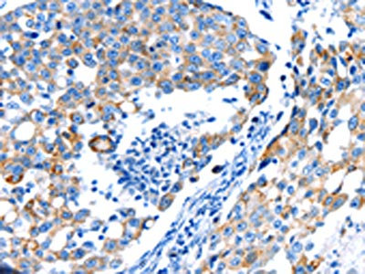 The image on the left is immunohistochemistry of paraffin-embedded Human breast cancer tissue using CSB-PA578328(POMC Antibody) at dilution 1/30, on the right is treated with synthetic peptide. (Original magnification: ×200)