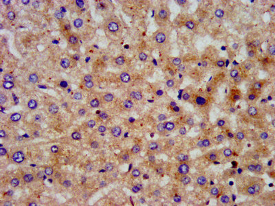 IHC image of CSB-PA614883LA01HU diluted at 1:200 and staining in paraffin-embedded human liver tissue performed on a Leica BondTM system. After dewaxing and hydration, antigen retrieval was mediated by high pressure in a citrate buffer (pH 6.0). Section was blocked with 10% normal goat serum 30min at RT. Then primary antibody (1% BSA) was incubated at 4°C overnight. The primary is detected by a biotinylated secondary antibody and visualized using an HRP conjugated SP system.