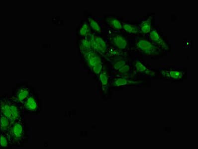 Immunofluorescent analysis of Hela cells using CSB-PA868326LA01HU at dilution of 1:100 and Alexa Fluor 488-congugated AffiniPure Goat Anti-Rabbit IgG(H+L)