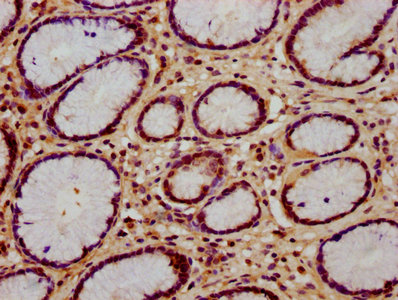 IHC image of CSB-PA018391LA01HU diluted at 1:600 and staining in paraffin-embedded human gastric cancer performed on a Leica BondTM system. After dewaxing and hydration, antigen retrieval was mediated by high pressure in a citrate buffer (pH 6.0). Section was blocked with 10% normal goat serum 30min at RT. Then primary antibody (1% BSA) was incubated at 4°C overnight. The primary is detected by a biotinylated secondary antibody and visualized using an HRP conjugated SP system.