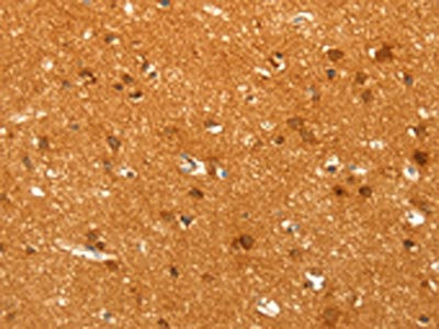The image on the left is immunohistochemistry of paraffin-embedded Human brain tissue using CSB-PA550936(POU5F1 Antibody) at dilution 1/30, on the right is treated with fusion protein. (Original magnification: ×200)