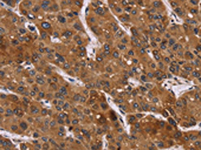The image on the left is immunohistochemistry of paraffin-embedded Human liver cancer tissue using CSB-PA085809(PPIB Antibody) at dilution 1/45, on the right is treated with fusion protein. (Original magnification: ×200)