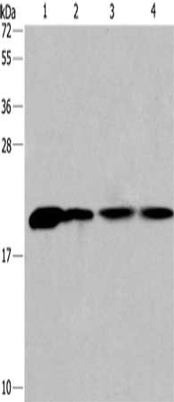 Gel: 10%SDS-PAGE, Lysate: 40 μg, Lane 1-4: Human fetal liver tissue, 293T cells, human liver cancer tissue, hela cells, Primary antibody: CSB-PA906437(PPIB Antibody) at dilution 1/450, Secondary antibody: Goat anti rabbit IgG at 1/8000 dilution, Exposure time: 20 seconds