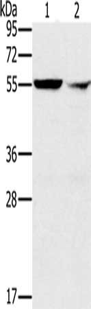 Gel: 8%SDS-PAGE, Lysate: 40 μg, Lane 1-2: K562 cells, human fetal liver tissue, Primary antibody: CSB-PA161857(PPM1F Antibody) at dilution 1/200, Secondary antibody: Goat anti rabbit IgG at 1/8000 dilution, Exposure time: 10 seconds