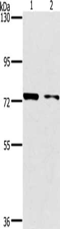 Gel: 6%SDS-PAGE, Lysate: 40 μg, Lane 1-2: MCF7 cells, hela cells, Primary antibody: CSB-PA296760(PPP1R13L Antibody) at dilution 1/500, Secondary antibody: Goat anti rabbit IgG at 1/8000 dilution, Exposure time: 30 seconds