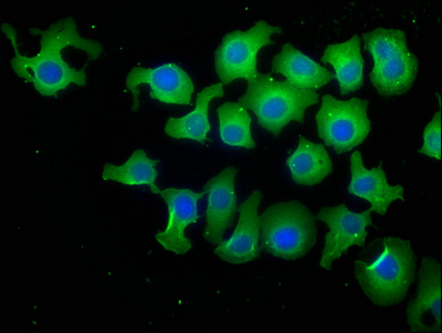 Immunofluorescence staining of A549 cells with CSB-PA851965OA01HU at 1:50, counter-stained with DAPI. The cells were fixed in 4% formaldehyde, permeabilized using 0.2% Triton X-100 and blocked in 10% normal Goat Serum. The cells were then incubated with the antibody overnight at 4°C. The secondary antibody was Alexa Fluor 488-congugated AffiniPure Goat Anti-Rabbit IgG(H+L).