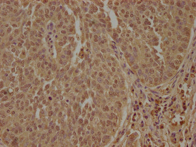 IHC image of CSB-PA851965OA01HU diluted at 1:100 and staining in paraffin-embedded human cervical cancer performed on a Leica BondTM system. After dewaxing and hydration, antigen retrieval was mediated by high pressure in a citrate buffer (pH 6.0). Section was blocked with 10% normal goat serum 30min at RT. Then primary antibody (1% BSA) was incubated at 4°C overnight. The primary is detected by a biotinylated secondary antibody and visualized using an HRP conjugated SP system.