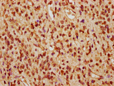 IHC image of CSB-PA00985A0Rb diluted at 1:260 and staining in paraffin-embedded human glioma performed on a Leica BondTM system. After dewaxing and hydration, antigen retrieval was mediated by high pressure in a citrate buffer (pH 6.0). Section was blocked with 10% normal goat serum 30min at RT. Then primary antibody (1% BSA) was incubated at 4°C overnight. The primary is detected by a biotinylated secondary antibody and visualized using an HRP conjugated SP system.