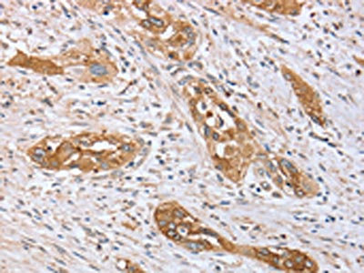 The image on the left is immunohistochemistry of paraffin-embedded Human esophagus cancer tissue using CSB-PA925621(PPP2R3A Antibody) at dilution 1/40, on the right is treated with synthetic peptide. (Original magnification: ×200)