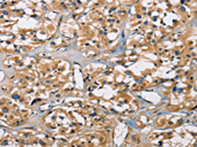 The image on the left is immunohistochemistry of paraffin-embedded Human thyroid cancer tissue using CSB-PA916143(PPP3CA Antibody) at dilution 1/30, on the right is treated with fusion protein. (Original magnification: ×200)
