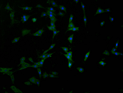 Immunofluorescence staining of MCF-7 cells with CSB-PA890940LA01HU at 1:100, counter-stained with DAPI. The cells were fixed in 4% formaldehyde and blocked in 10% normal Goat Serum. The cells were then incubated with the antibody overnight at 4°C. The secondary antibody was Alexa Fluor 488-congugated AffiniPure Goat Anti-Rabbit IgG(H+L).