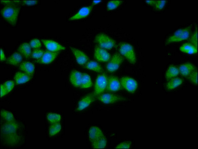 Immunofluorescence staining of Hela cells with CSB-PA882077LA01HU at 1:200, counter-stained with DAPI. The cells were fixed in 4% formaldehyde, permeabilized using 0.2% Triton X-100 and blocked in 10% normal Goat Serum. The cells were then incubated with the antibody overnight at 4°C. The secondary antibody was Alexa Fluor 488-congugated AffiniPure Goat Anti-Rabbit IgG(H+L).