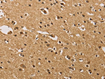 The image on the left is immunohistochemistry of paraffin-embedded Human brain tissue using CSB-PA246357(PRDM14 Antibody) at dilution 1/40, on the right is treated with fusion protein. (Original magnification: ×200)
