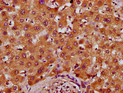 IHC image of CSB-PA018665LA01HU diluted at 1:400 and staining in paraffin-embedded human liver tissue performed on a Leica BondTM system. After dewaxing and hydration, antigen retrieval was mediated by high pressure in a citrate buffer (pH 6.0). Section was blocked with 10% normal goat serum 30min at RT. Then primary antibody (1% BSA) was incubated at 4°C overnight. The primary is detected by a biotinylated secondary antibody and visualized using an HRP conjugated SP system.