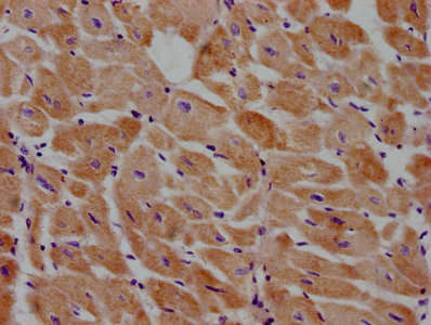 IHC image of CSB-PA018678PA01HU diluted at 1:100 and staining in paraffin-embedded human heart tissue performed on a Leica BondTM system. After dewaxing and hydration, antigen retrieval was mediated by high pressure in a citrate buffer (pH 6.0). Section was blocked with 10% normal goat serum 30min at RT. Then primary antibody (1% BSA) was incubated at 4°C overnight. The primary is detected by a biotinylated secondary antibody and visualized using an HRP conjugated SP system.