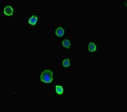 Immunofluorescent analysis of MCF-7 cells using CSB-PA805325LA01HU at dilution of 1:100 and Alexa Fluor 488-congugated AffiniPure Goat Anti-Rabbit IgG(H+L)