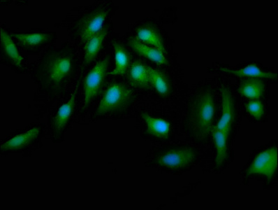 Immunofluorescence staining of Hela cells with CSB-PA15899A0Rb at 1:133, counter-stained with DAPI. The cells were fixed in 4% formaldehyde, permeabilized using 0.2% Triton X-100 and blocked in 10% normal Goat Serum. The cells were then incubated with the antibody overnight at 4°C. The secondary antibody was Alexa Fluor 488-congugated AffiniPure Goat Anti-Rabbit IgG(H+L).