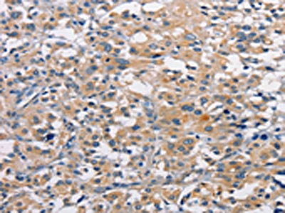The image on the left is immunohistochemistry of paraffin-embedded Human liver cancer tissue using CSB-PA999801(PRKCE Antibody) at dilution 1/50, on the right is treated with fusion protein. (Original magnification: ×200)
