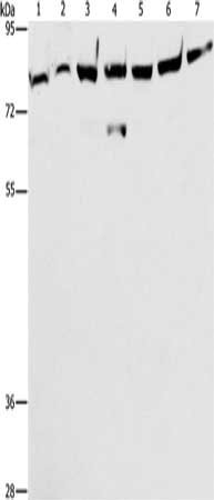 Gel: 6%SDS-PAGE, Lysate: 40 μg, Lane 1-7: A172 cells, mouse brain tissue, K562 cells, 231 cells, A549 cells, hela cells, hepG2 cells, Primary antibody: CSB-PA999801(PRKCE Antibody) at dilution 1/400, Secondary antibody: Goat anti rabbit IgG at 1/8000 dilution, Exposure time: 30 seconds