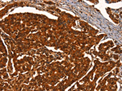 The image on the left is immunohistochemistry of paraffin-embedded Human breast cancer tissue using CSB-PA177777(PRKD1 Antibody) at dilution 1/40, on the right is treated with synthetic peptide. (Original magnification: ×200)