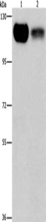 Gel: 6%SDS-PAGE, Lysate: 40 μg, Lane 1-2: 293T cells, NIH/3T3 cells, Primary antibody: CSB-PA177777(PRKD1 Antibody) at dilution 1/550, Secondary antibody: Goat anti rabbit IgG at 1/8000 dilution, Exposure time: 30 seconds