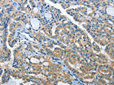 The image on the left is immunohistochemistry of paraffin-embedded Human thyroid cancer tissue using CSB-PA905220(PRKX Antibody) at dilution 1/15, on the right is treated with synthetic peptide. (Original magnification: ×200)