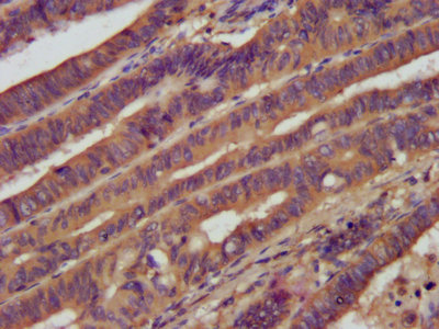 IHC image of CSB-PA018751LA01HU diluted at 1:1200 and staining in paraffin-embedded human colon cancer performed on a Leica BondTM system. After dewaxing and hydration, antigen retrieval was mediated by high pressure in a citrate buffer (pH 6.0). Section was blocked with 10% normal goat serum 30min at RT. Then primary antibody (1% BSA) was incubated at 4°C overnight. The primary is detected by a biotinylated secondary antibody and visualized using an HRP conjugated SP system.