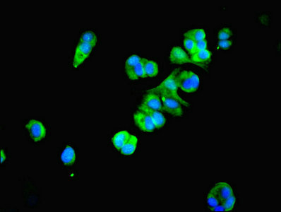 Immunofluorescent analysis of MCF-7 cells using CSB-PA01374A0Rb at dilution of 1:100 and Alexa Fluor 488-congugated AffiniPure Goat Anti-Rabbit IgG(H+L)