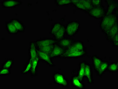 Immunofluorescent analysis of HepG2 cells using CSB-PA010083LA01HU at dilution of 1:100 and Alexa Fluor 488-congugated AffiniPure Goat Anti-Rabbit IgG(H+L)