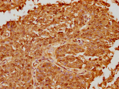 IHC image of CSB-PA018886LA01HU diluted at 1:100 and staining in paraffin-embedded human cervical cancer performed on a Leica BondTM system. After dewaxing and hydration, antigen retrieval was mediated by high pressure in a citrate buffer (pH 6.0). Section was blocked with 10% normal goat serum 30min at RT. Then primary antibody (1% BSA) was incubated at 4°C overnight. The primary is detected by a biotinylated secondary antibody and visualized using an HRP conjugated SP system.