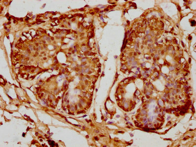 IHC image of CSB-PA018886LA01HU diluted at 1:100 and staining in paraffin-embedded human breast cancer performed on a Leica BondTM system. After dewaxing and hydration, antigen retrieval was mediated by high pressure in a citrate buffer (pH 6.0). Section was blocked with 10% normal goat serum 30min at RT. Then primary antibody (1% BSA) was incubated at 4°C overnight. The primary is detected by a biotinylated secondary antibody and visualized using an HRP conjugated SP system.